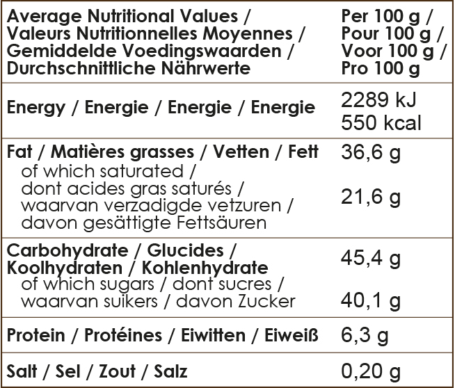 ►Cacao, sucre de canne et vanille: issus du commerce équitable Fairtrade, cultivés par des producteurs certifiés et commercialisés selon les standards Fairtrade, 92% du poids total. Visitez info.fairtrade.net/sourcing