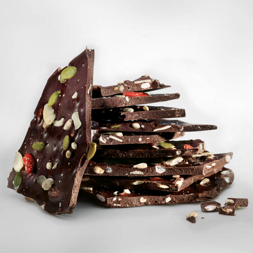 Chocolat noir bio 60% – quinoa – baies de goji – amandes – graines de tournesol – graines de courge – éclats de cacao pur.