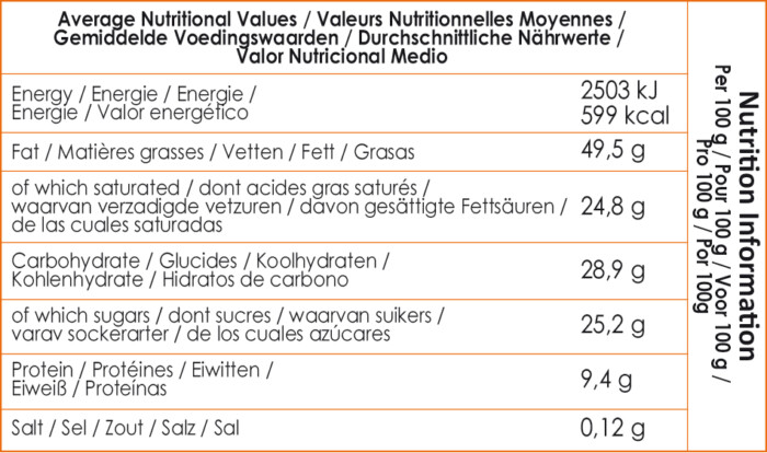 ►Cacao: issu du commerce équitable Fairtrade, cultivé par des producteurs certifiés et commercialisés selon les standards Fairtrade, 59% du poids total. Visitez info.fairtrade.net/sourcing
