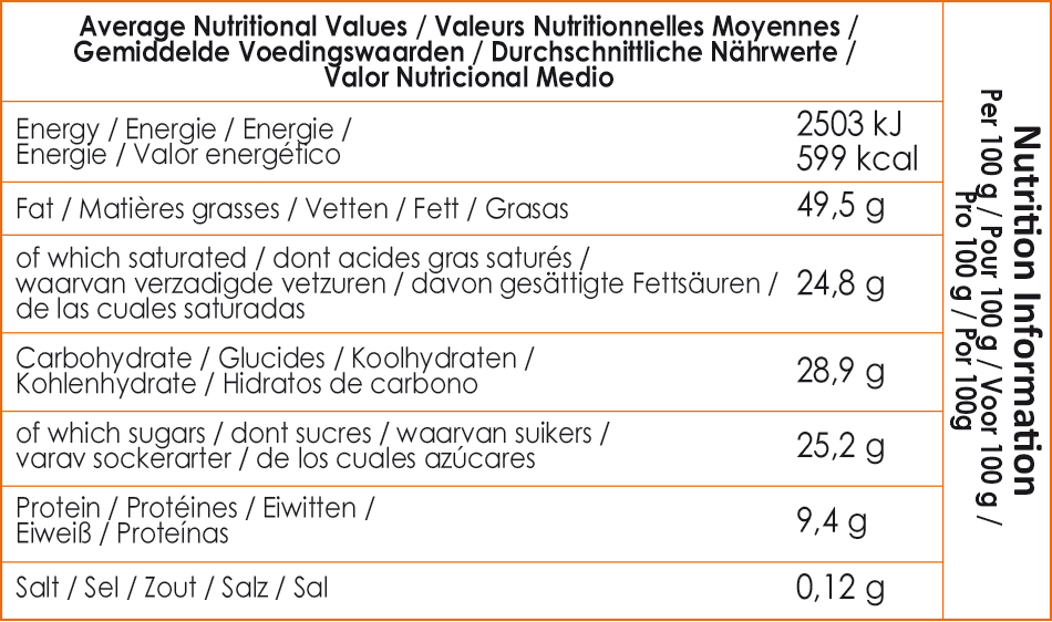 Peut contenir des traces d’amandes, pistaches, soja et lait.